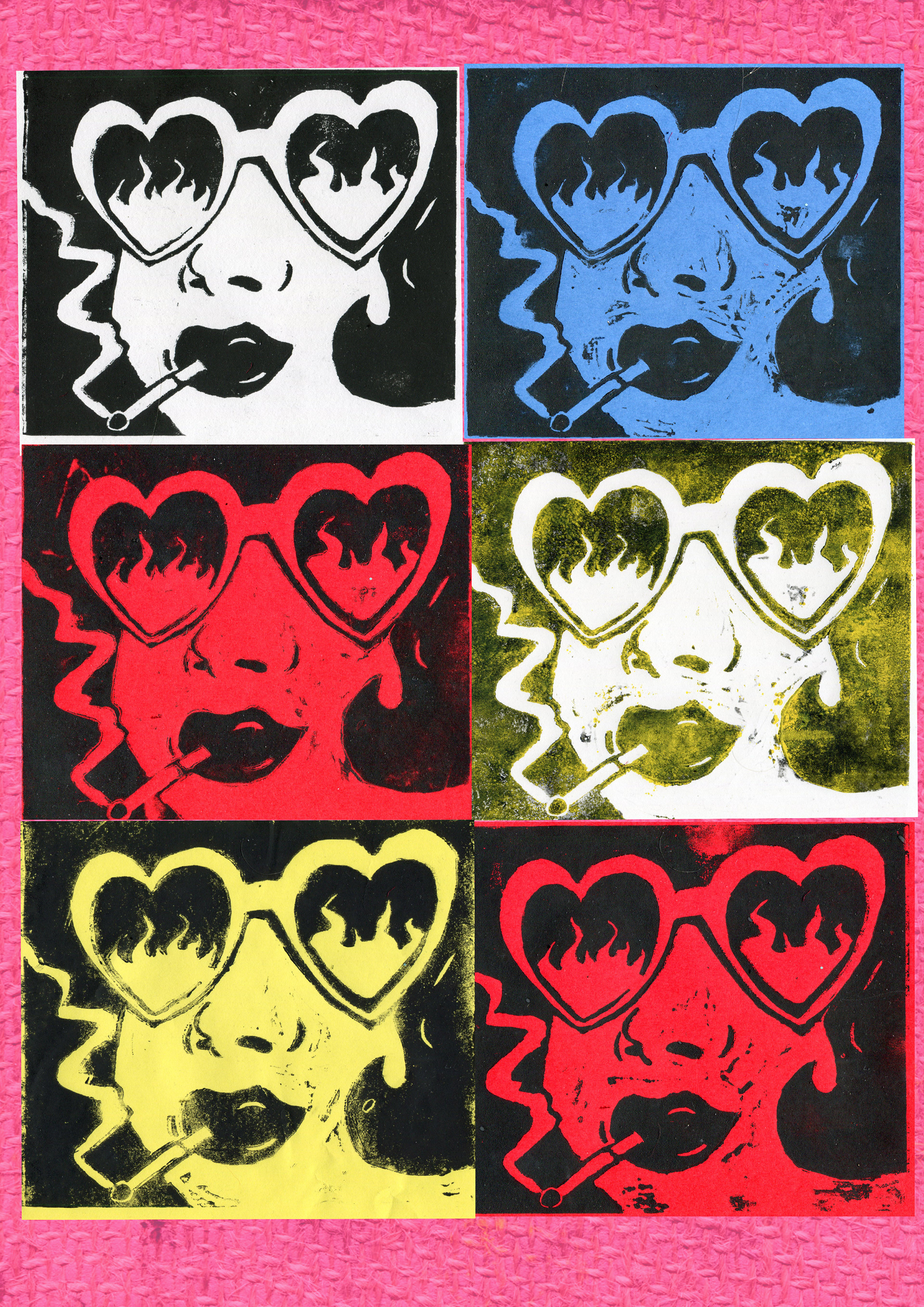 Motiv, hjerteformede solbriller, på farget ark, trykket med svart linoliumsmaling i trykkpresse.