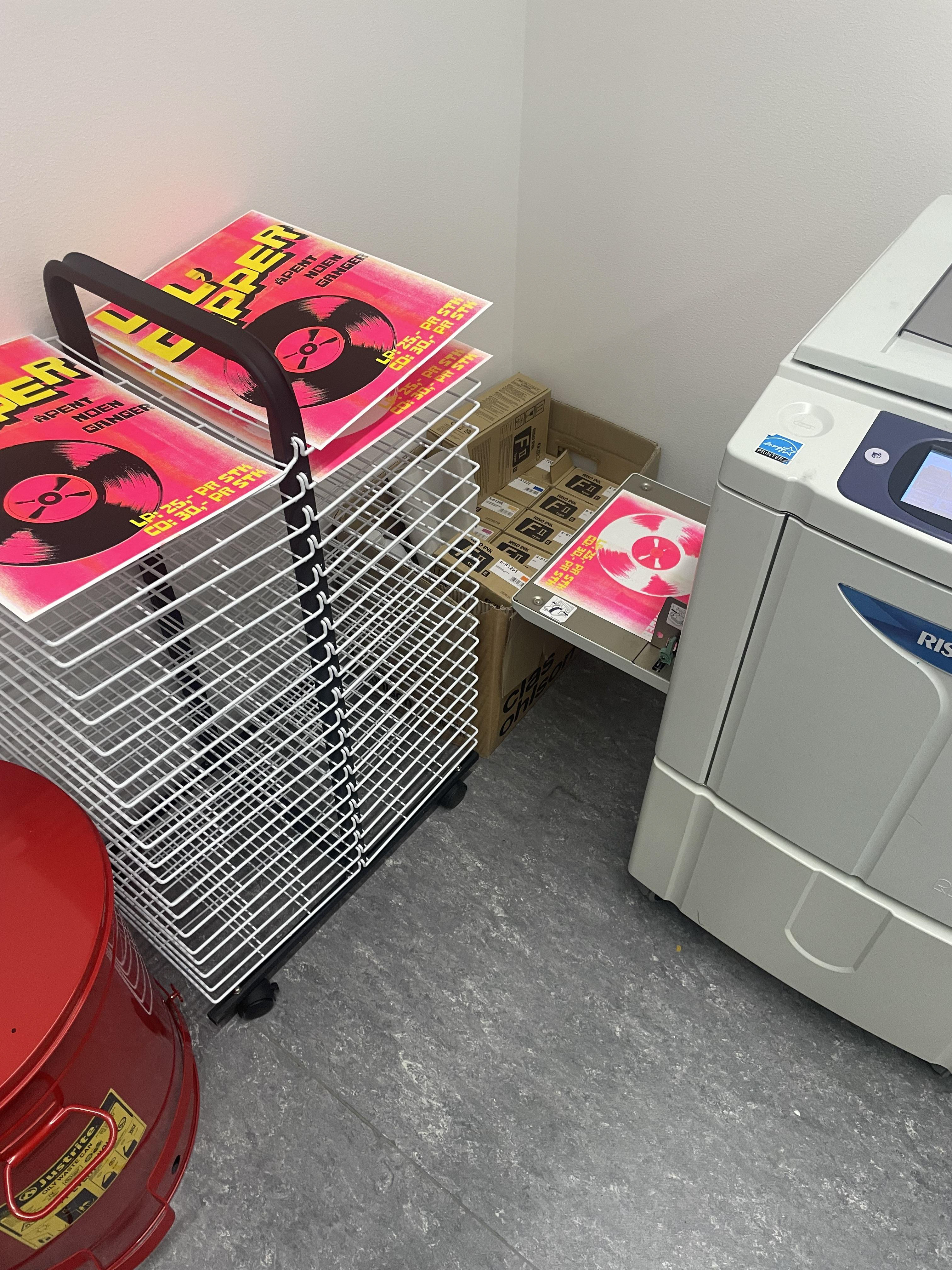 Denne plakaten ble laget for å promotere Li’l Dipper, en pop-up vinylthriftshop fra Big Dipper. Trykket i fluorescerende rosa, gul og svart.